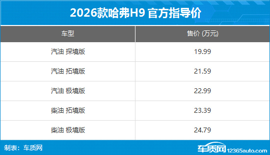 2026年4月28日,车质网从哈弗官方获悉,2026款哈弗H9正式上市。新车作为年度改款,围绕智慧交互、质感舒适和越野驾控三大维度进行升级。此次上市新车共推出5款车型,官方指导价19.99-24.79万元,限时换新价17.49-22.29万元。